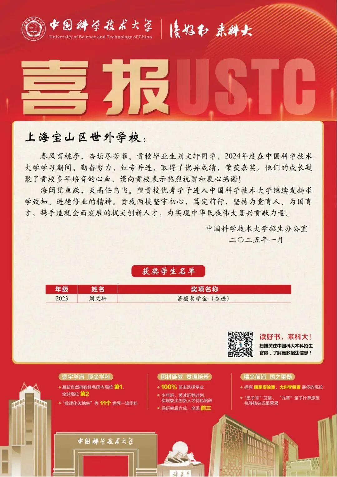 上海宝山区世外学校近期收到来自中国科技大学招生办公室的喜报,祝贺宝山世外高中国内部输送到中科大的首位校友刘文轩同学荣获2024年度“蔷薇奖学金”,肯定了宝山世外对毕业生的培养成果,表达了携手培养拔尖创新人才的期望。