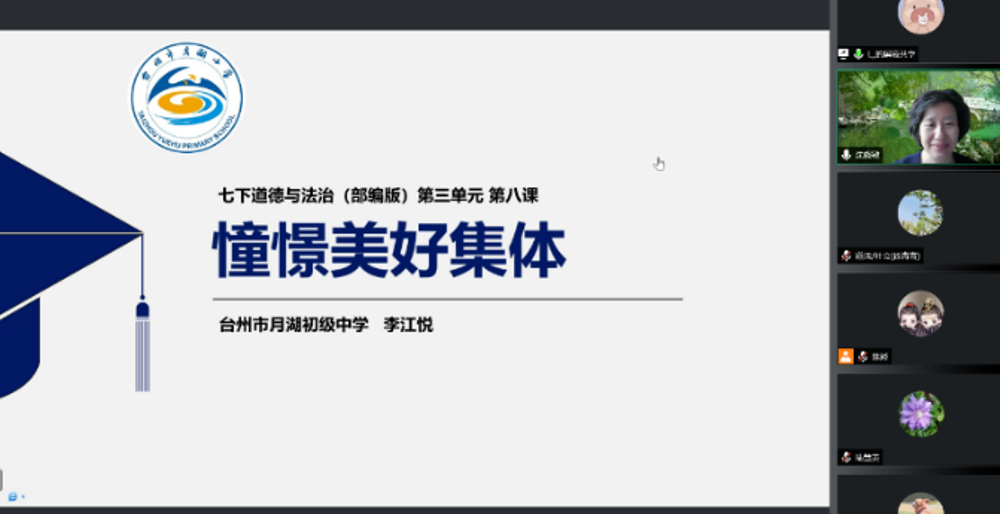 上午,台州月湖中学的李江悦老师进行主题为《憧憬美好的集体》的说课,李老师从教材学情分析、教法学法、教学设计和板书设计等几个方面进行展示。